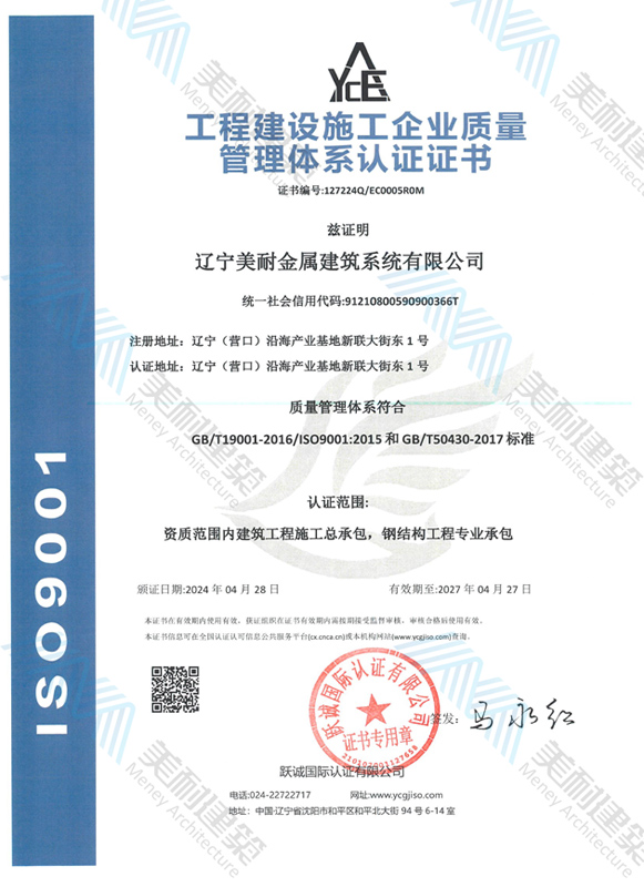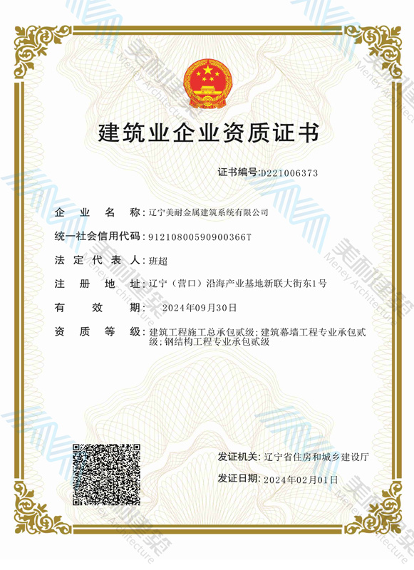 遼寧美耐金屬建筑系統(tǒng)有限公司位于遼寧(營口)沿海產(chǎn)業(yè)基地,專注于預制金屬建筑系統(tǒng)領域,是一家集工業(yè)建筑設計、制作、施工及相關的技術咨詢與服務為一體的綜合性服務企業(yè)。作為國家鋼結構協(xié)會會員、中國建筑金屬結構協(xié)會會員單位與國家高新技術企業(yè),美耐建筑集建筑工程施工總承包、鋼結構工程專業(yè)承包等多種資質(zhì)于一身,并擁有22項鋼結構建筑領域專利,9項軟件著作權。
